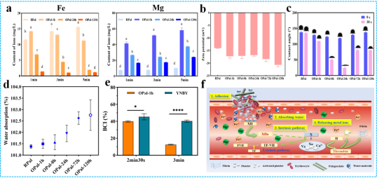 研究表明,隨著草酸溶蝕時(shí)間的延長(zhǎng),凹凸棒石骨架中可釋放的Fe3+和Mg2+離子顯著減少,表面電荷更負(fù),接觸角顯著下降后略有增加。溶蝕1h時(shí)較好地保留了止血過(guò)程所需的3價(jià)鐵離子和2價(jià)鎂離子,有利于加速凝血反應(yīng)。