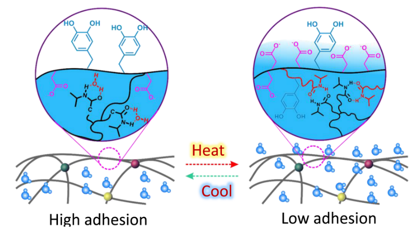 這項突破并非一蹴而就。周峰回憶,幾年前,團隊一直攻關(guān)高強韌黏附水凝膠材料,偶然發(fā)現(xiàn)一種材料在多次按壓后黏性驟降?!霸摤F(xiàn)象引發(fā)了我們的極大興趣,經(jīng)過對材料的成分分析、機理驗證等,才知道原來在多次按壓以后,手部溫度傳遞到凝膠表面,致使凝膠發(fā)生相變,呈現(xiàn)低黏附態(tài)。”這讓團隊意識到,溫度可能是調(diào)控黏附性能的鑰匙。