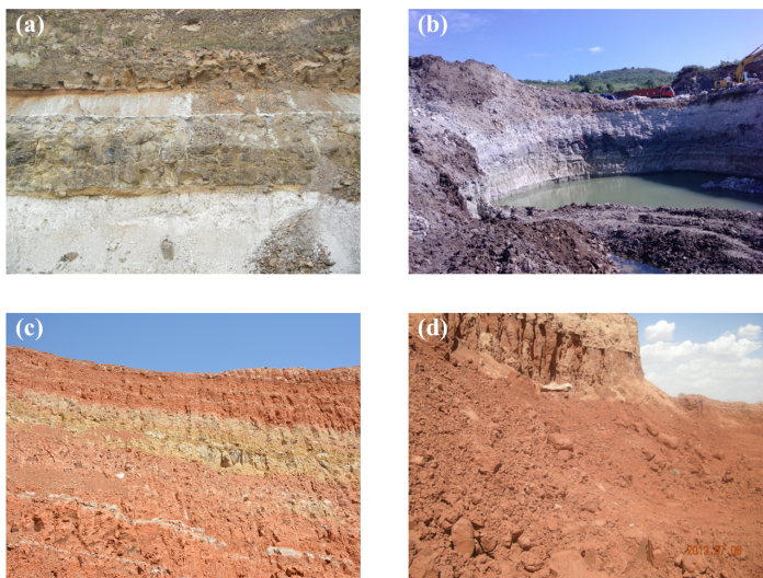 (a)安徽明光、(b)江蘇盱眙、(c)甘肅臨澤和(d)內蒙古杭錦旗凹凸棒石礦山