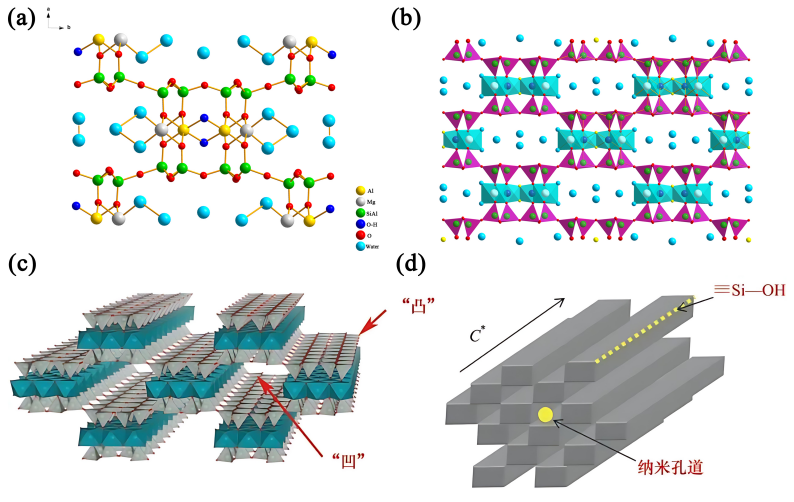 凹凸棒石晶體結構(a, b)和孔道結構(c, d)示意圖(圖片來源:中國科學院蘭州化學物理研究所)