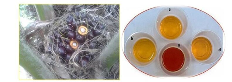 凹凸棒石棕櫚油脫色劑脫色效果對比,(a)原油,(b,d)凹凸棒石基脫色劑,(c)市售脫色劑