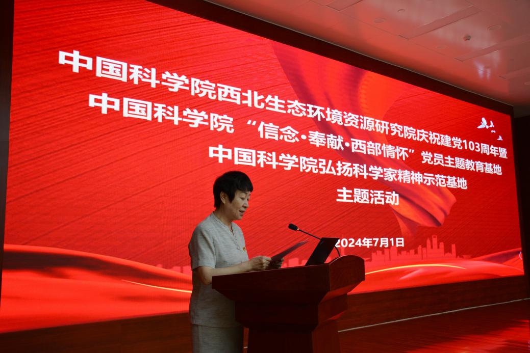 為慶祝中國(guó)共產(chǎn)黨成立103周年,7月1日,中國(guó)科學(xué)院西北生態(tài)環(huán)境資源研究院舉行中國(guó)科學(xué)院“信念·奉獻(xiàn)·西部情懷”黨員主題教育基地、中國(guó)科學(xué)院弘揚(yáng)科學(xué)家精神示范基地主題活動(dòng)。西北研究院黨委委員、領(lǐng)導(dǎo)班子成員、紀(jì)委委員、院務(wù)委員,黨支部書(shū)記、支部委員,研究室(中心)、實(shí)驗(yàn)室、野外臺(tái)站和管理部門黨員負(fù)責(zé)人,黨員代表等參加活動(dòng)。黨委副書(shū)記、紀(jì)委書(shū)記王萍主持活動(dòng)。