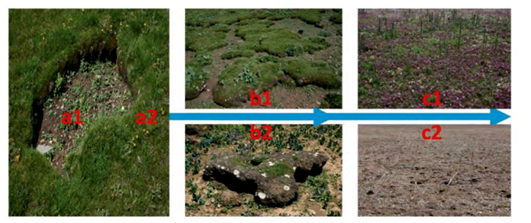 禿斑塊擴(kuò)張與“黑土灘”退化草地的形成過(guò)程示意圖