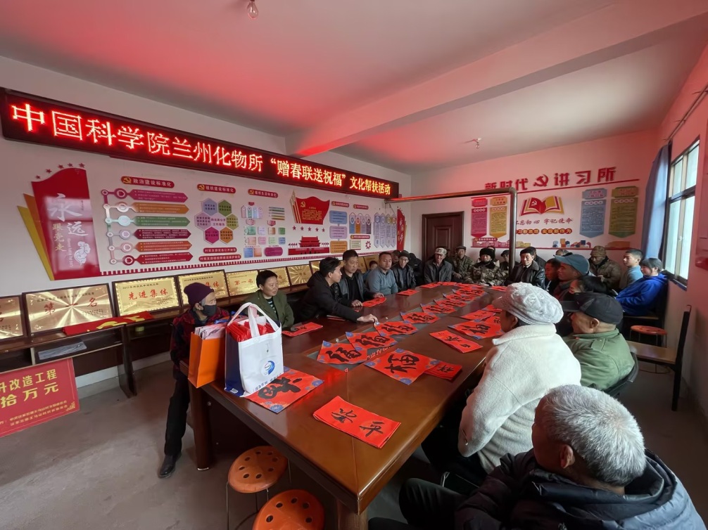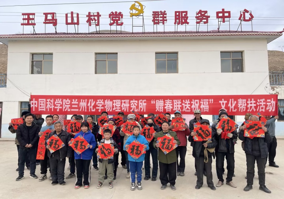 為豐富農(nóng)村精神文化生活,在2025年新春佳節(jié)來臨之際,1月23日下午,中國科學(xué)院蘭州化學(xué)物理研究所在會寧縣漢家岔鎮(zhèn)王馬山村開展了“贈春聯(lián) 送祝?!被顒樱瑸閹头龃謇相l(xiāng)們送去研究所的關(guān)心問候和美好祝福。