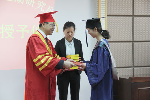 畢業(yè)典禮在與會人員集體奏唱國歌聲中拉開序幕。主持工作的副所長吳志堅(jiān)代表所領(lǐng)導(dǎo)發(fā)表講話,對2017屆畢業(yè)生表示衷心地祝賀,對今后的發(fā)展提出了四個(gè)“好”:思想好、身體好、學(xué)習(xí)好、工作好。殷切期望畢業(yè)生能有一個(gè)積極、樂觀、不斷進(jìn)取的健康思想,能夠積極進(jìn)行體育鍛煉,保持健康身體,能夠在今后的道路上不斷學(xué)習(xí),成為今后工作崗位上的棟梁之才,能夠積極應(yīng)對工作中遇到的各種情況,對工作富有熱情。吳志堅(jiān)還宣讀了中國科學(xué)院大學(xué)丁仲禮校長給2017屆畢業(yè)生的一封信,希望畢業(yè)生擔(dān)負(fù)起丁仲禮校長所給予的厚望。