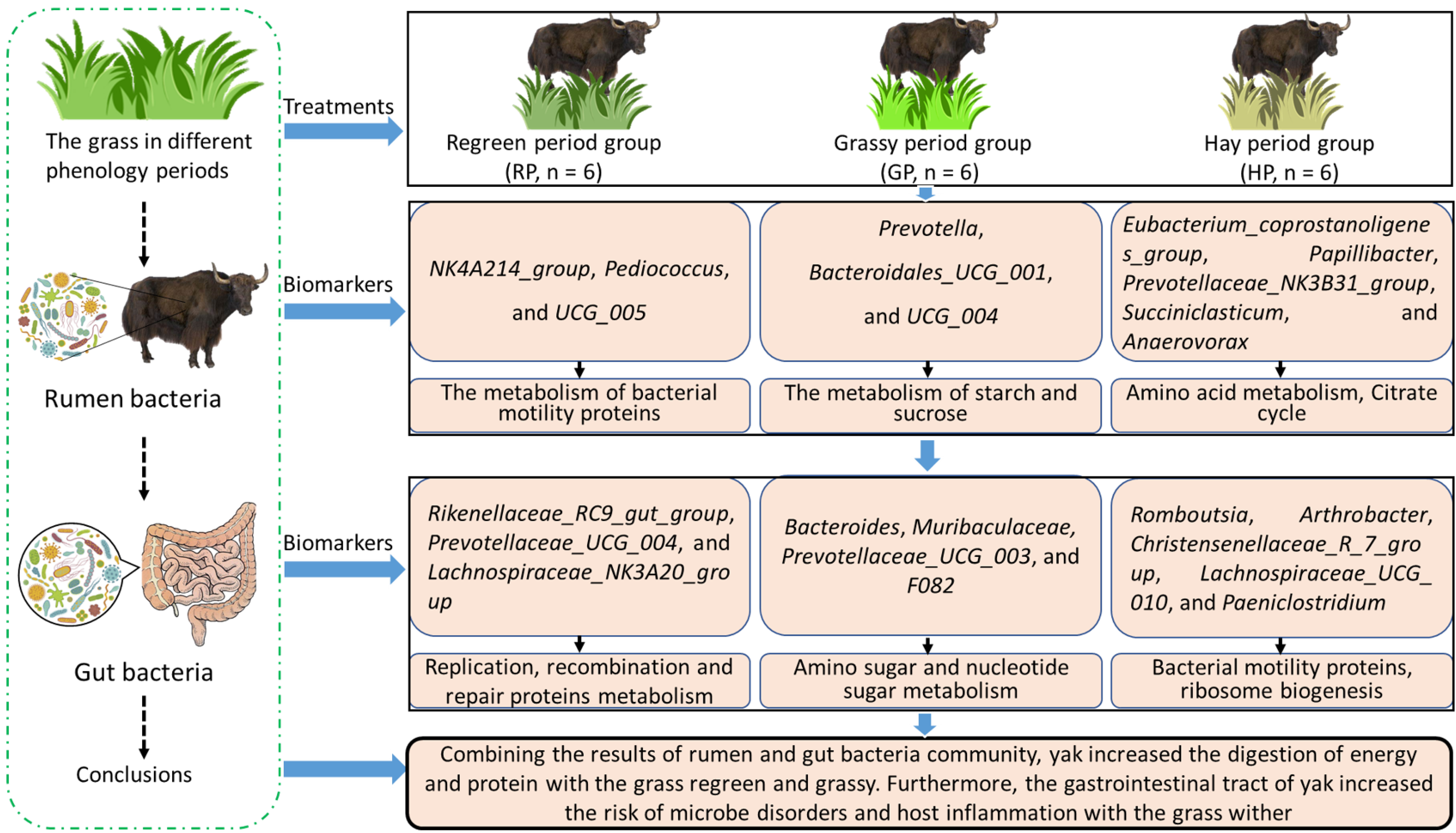 中國科學院西北高原生物研究所高寒生態(tài)監(jiān)測與可持續(xù)發(fā)展研究團隊以放牧牦牛為研究對象,以牧草營養(yǎng)組成、腸道微生物和牦牛肉品質為切入點,采用16S rRNA測序和代謝組學等研究方法。探究了不同物候期牧草組成對牦牛胃腸道微生物及肉品質的影響,闡明了“物候期牧草-瘤胃微生物-牦牛肉品質”之間的關系及其調控機制。結果表明,不同物候期的牧草營養(yǎng)組成改變了放牧牦牛瘤胃微生物群落,同時,微生物的季節(jié)性變化參與了牦牛肉品質的調控。