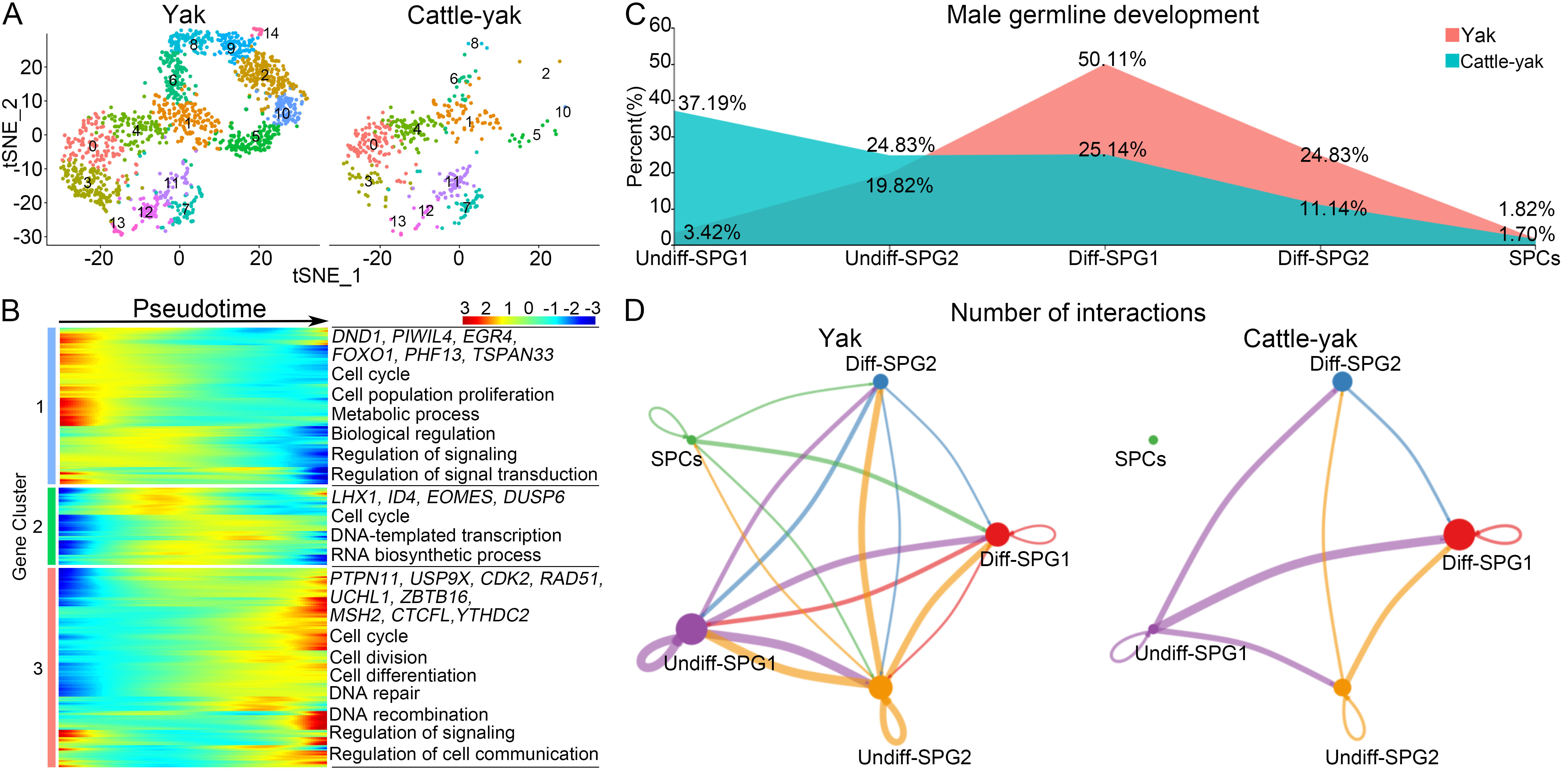 單細(xì)胞轉(zhuǎn)錄組分析揭示犏牛精原細(xì)胞命運(yùn)決定異常。A:牦牛和犏牛生殖細(xì)胞單細(xì)胞tSNE聚類圖;B:隨擬時(shí)序變化的不同類型生殖細(xì)胞基因表達(dá)特征分析;C:兩種牛精原細(xì)胞和早期精母細(xì)胞比例;D:細(xì)胞通訊分析顯示兩種牛不同類型精原細(xì)胞互作存在顯著差異。未分化型精原細(xì)胞1(Undiff-SPG1)、未分化型精原細(xì)胞2(Undiff-SPG2)、分化型精原細(xì)胞1(Diff-SPG1)、分化型精原細(xì)胞2(Diff-SPG2)和精母細(xì)胞(SPCs)