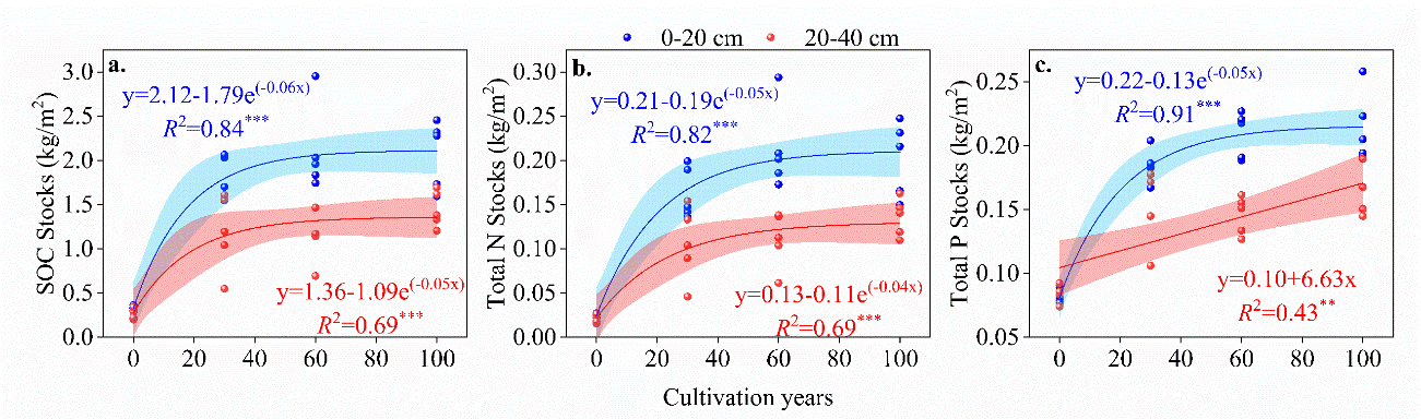 中國科學(xué)院西北生態(tài)環(huán)境資源研究院科研團(tuán)隊(duì)對張掖綠洲區(qū)不同開墾年限農(nóng)田土壤的碳儲量和養(yǎng)分儲量進(jìn)行了探究,通過回歸分析揭示了碳庫和養(yǎng)分庫隨常規(guī)耕作年限的變化模式,并結(jié)合隨機(jī)森林模型等分析了影響碳庫和養(yǎng)分庫的關(guān)鍵因子。研究發(fā)現(xiàn),沙漠開墾后0-40 cm土壤碳庫擴(kuò)大了4.2倍,氮儲量和磷儲量增加了1.2-6.5倍。然而,回歸分析表明碳儲量和養(yǎng)分儲量均隨耕作年限的增加呈指數(shù)變化模式,在常規(guī)耕作60年后,0-40 cm土層的碳庫和氮儲量及表層土壤中的磷儲量停止增長。土壤化學(xué)計(jì)量、pH和機(jī)械組成是影響綠洲農(nóng)田土壤碳庫和養(yǎng)分庫的關(guān)鍵因素。研究表明,雖然沙漠開墾后土壤質(zhì)量得到了顯著改善,但長期的常規(guī)管理措施限制了改良效應(yīng),因此,干旱區(qū)綠洲農(nóng)田的常規(guī)管理措施中應(yīng)適當(dāng)引入保護(hù)性耕作措施,以實(shí)現(xiàn)農(nóng)田土壤的可持續(xù)生產(chǎn)。