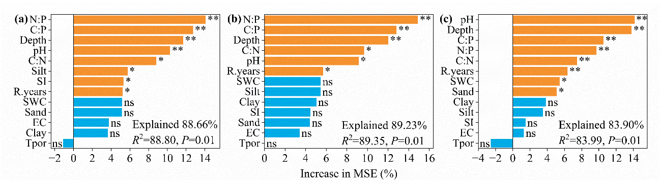 圖2?土壤理化指標(biāo)在解釋有機(jī)碳儲量(a)、總氮儲量(b)和總磷儲量(c)變化中的重要性