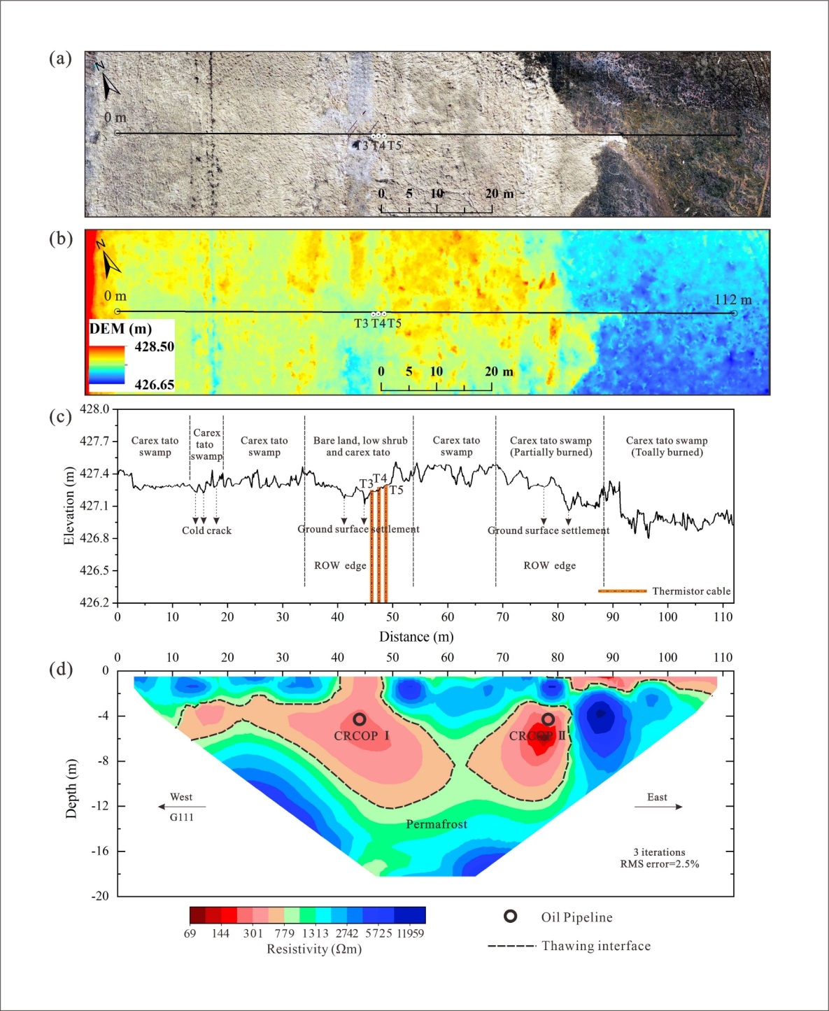 (c)地形、植被、鉆孔、管權(quán)范圍和凍土災(zāi)害等信息?。╠) ERT反演結(jié)果