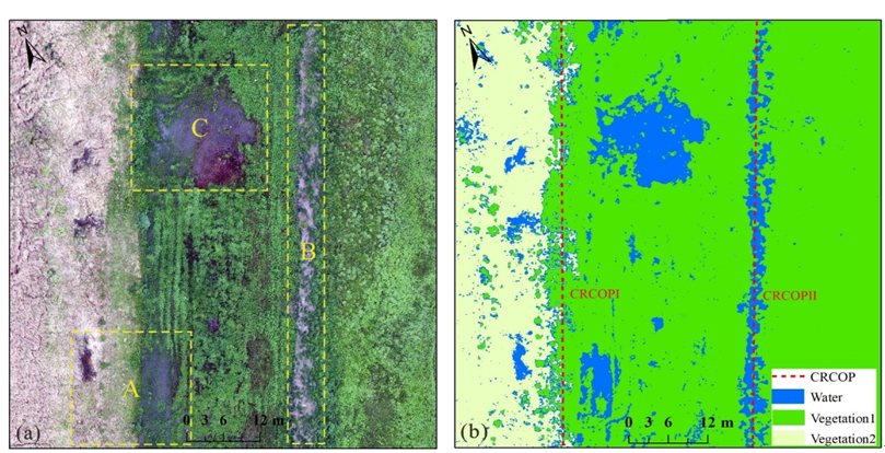 圖3 管道沿線積水分布?。╝)無(wú)人機(jī)正射影像 (b)影像監(jiān)督分類(lèi)結(jié)果
