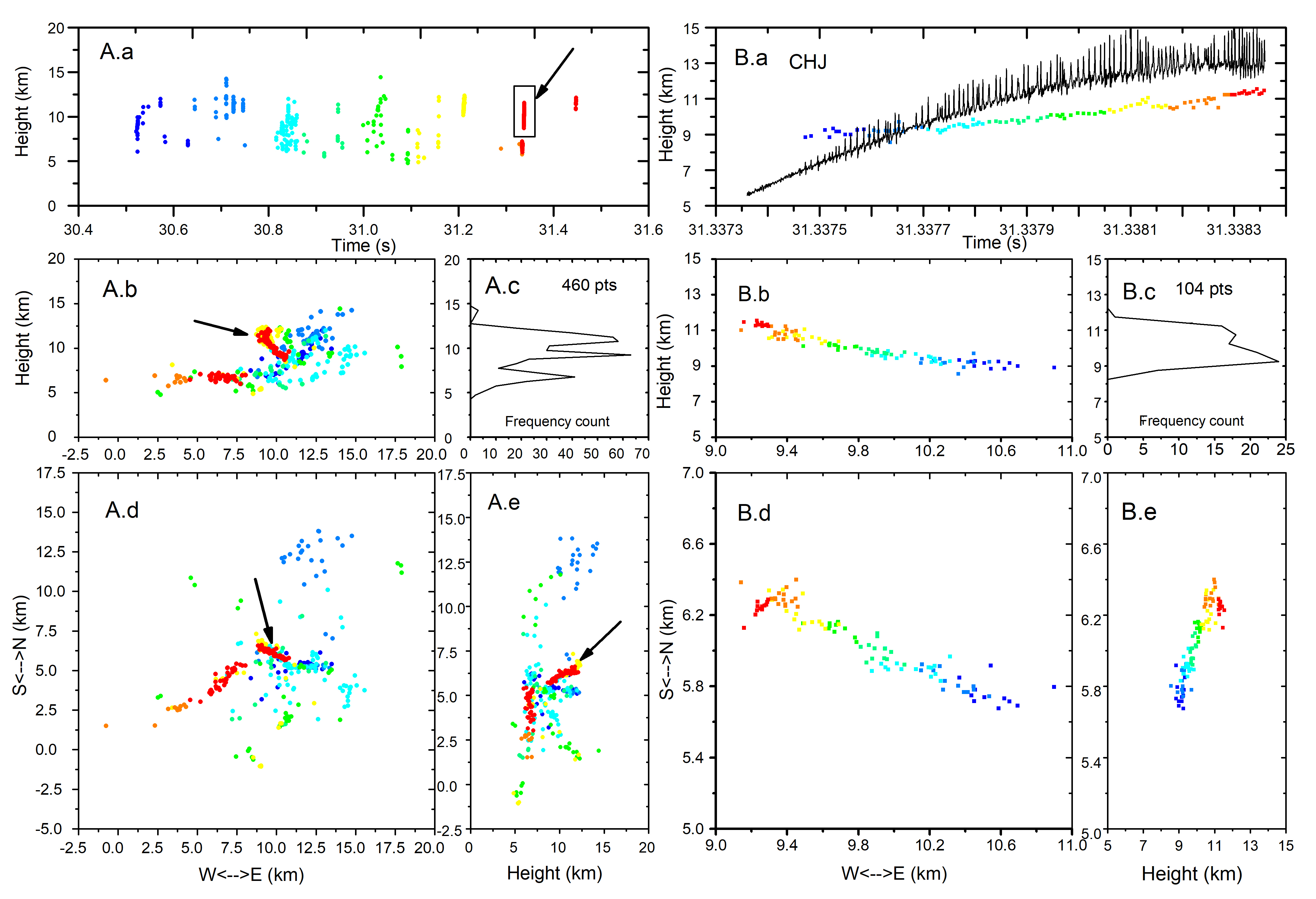 圖 1. 云閃(A)及其規(guī)則脈沖爆發(fā)序列?。≧PBs,B) 的三維觀測?。╝) 高度-時間關系圖,以及在CHJ站測量的LF/VLF電場,該站作為坐標原點;(b) 東-西方向的垂直投影;(c) 輻射源數(shù)量及高度統(tǒng)計(RPBs 在 1 毫秒內產(chǎn)生104脈沖);(d ,e) 平面圖和輻射源的南-北方向垂直投影(圖A出自 Fan 等 ,2018)。