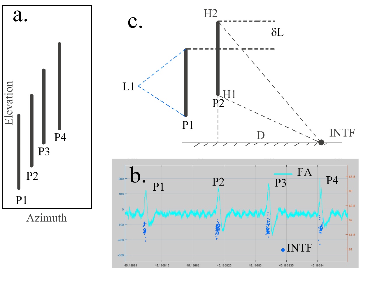 圖2. VHF干涉儀(Fan et al.,2023a;2023b)對規(guī)則脈沖爆發(fā)序列中連續(xù)脈沖的二維觀測結果,顯示這些脈沖比正常的直竄先導速度更快,并且從一個脈沖到另一個脈沖之間重疊較強?。╝)。從平面距離 D?。健?.8 公里和干涉儀仰角的差異(例如,60.5° 和 60°),可以得出脈沖的 VHF輻射源的垂直范圍約為 205 米?。╟)。這一現(xiàn)象發(fā)生在約 2 微秒的時間間隔內,對應的速度約為 108 米/秒。脈沖代表的擊穿速度遠高于已知的閃電先導通道發(fā)展速度。
