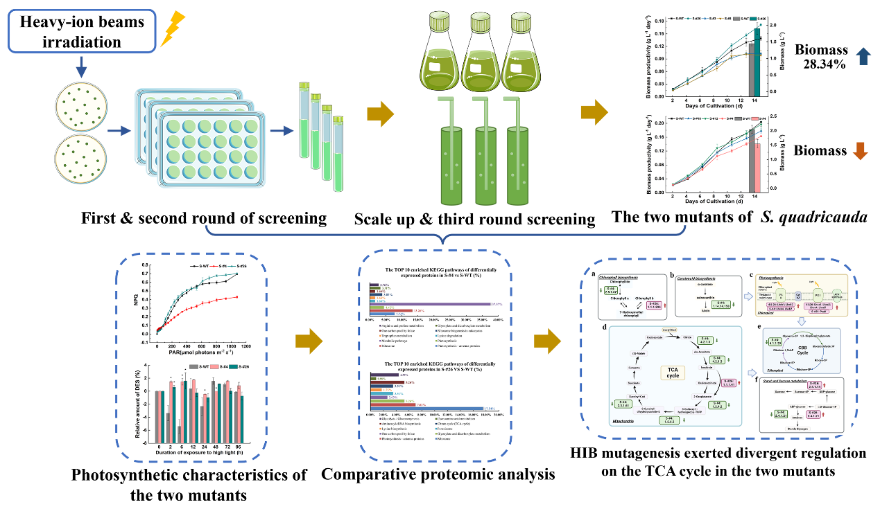 科研人員利用蘭州重離子研究裝置(HIRFL)提供的碳離子束,對(duì)環(huán)境適應(yīng)性強(qiáng)的四尾柵藻進(jìn)行了誘變選育,獲得了兩株光合特性、固碳能力與野生型對(duì)比鮮明的突變株;其中高固碳能力突變株生物量積累高于野生型的28.34?。?span lang="zh-CN" style="margin-top: 12px; margin-bottom: 12px; line-height: 1.5em; font-family: arial, helvetica, sans-serif; font-size: 16px;" data-index="9">,并且表現(xiàn)出對(duì)長時(shí)間高光脅迫的適應(yīng)性。通過對(duì)兩株突變株光合特征與比較蛋白組學(xué)的關(guān)聯(lián)分析,科研人員發(fā)現(xiàn)重離子束輻射誘導(dǎo)的中心碳代謝差異蛋白對(duì)突變株固碳能力強(qiáng)弱起到重要調(diào)控作用;另外,與突變株固碳能力關(guān)聯(lián)的三羧酸循環(huán)差異調(diào)控,為高效固碳微藻工程株選育提供了潛在靶點(diǎn)。