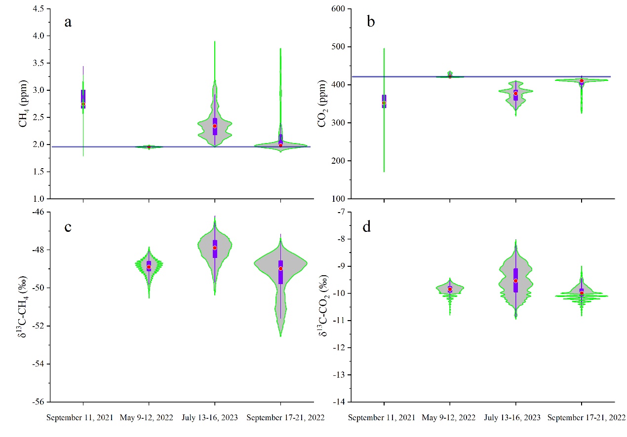 圖2.不同時期冰洞內(nèi)甲烷、二氧化碳濃度和其同位素特征