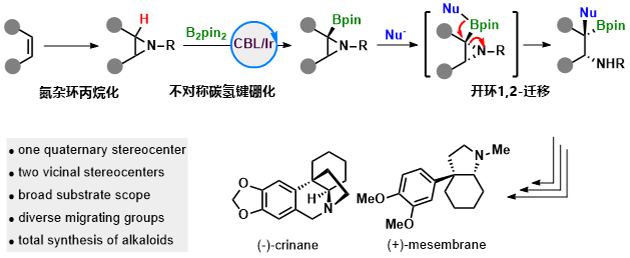 近日,該團(tuán)隊(duì)針對(duì)簡(jiǎn)單烯烴不對(duì)稱多官能團(tuán)化存在的問題,利用其發(fā)展的CBL/銥催化體系,結(jié)合烯烴的氮雜環(huán)丙烷化/開環(huán)1,2-遷移硼化的組合策略,實(shí)現(xiàn)了簡(jiǎn)單烯烴的不對(duì)稱三官能團(tuán)化反應(yīng),高對(duì)映選擇性地實(shí)現(xiàn)了鄰位季碳中心的手性胺。同時(shí),利用該方法,團(tuán)隊(duì)首次實(shí)現(xiàn)了從廉價(jià)易得的環(huán)己烯到石蒜科生物堿(-)-crinane(+)-mesembrane的對(duì)映選擇性全合成。