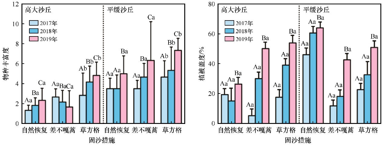 土壤性狀改善和植物群落重建是沙漠化防治取得成效的重要表征,明晰不同沙漠化防治措施下植物群落與土壤因子的變化趨勢及關(guān)聯(lián)特征,有助于篩選最佳的沙漠化治理措施。