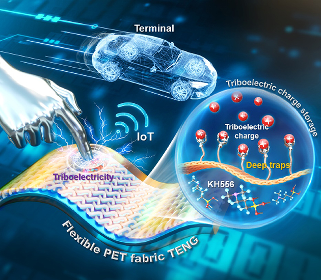 摩擦起電過程中產(chǎn)生的電荷會(huì)瞬時(shí)存儲(chǔ)在電介質(zhì)表面,進(jìn)而被兩種不同類型的陷阱(淺陷阱和深陷阱)捕獲。其中,淺陷阱中的電荷容易逸出,優(yōu)先耗散到環(huán)境中,而深陷阱中的電荷則因?yàn)闃O難逸出,可長期儲(chǔ)存。因此,影響摩擦層電荷耗散率的關(guān)鍵因素是陷阱捕獲電荷和被捕獲電荷的逃逸能力。基于此,該團(tuán)隊(duì)通過系統(tǒng)研究,揭示了載流子深陷阱在摩擦電荷存儲(chǔ)中的機(jī)制,通過分子自組裝技術(shù)在織物摩擦層界面構(gòu)建載流子深陷阱的方式增加TENG的電輸出,將該織物TENG用于物聯(lián)網(wǎng)可穿戴電子設(shè)備的電源模塊,實(shí)現(xiàn)了對機(jī)械運(yùn)動(dòng)的穩(wěn)定控制。相關(guān)研究成果發(fā)表在Advanced Materials(2024,2303389)上。