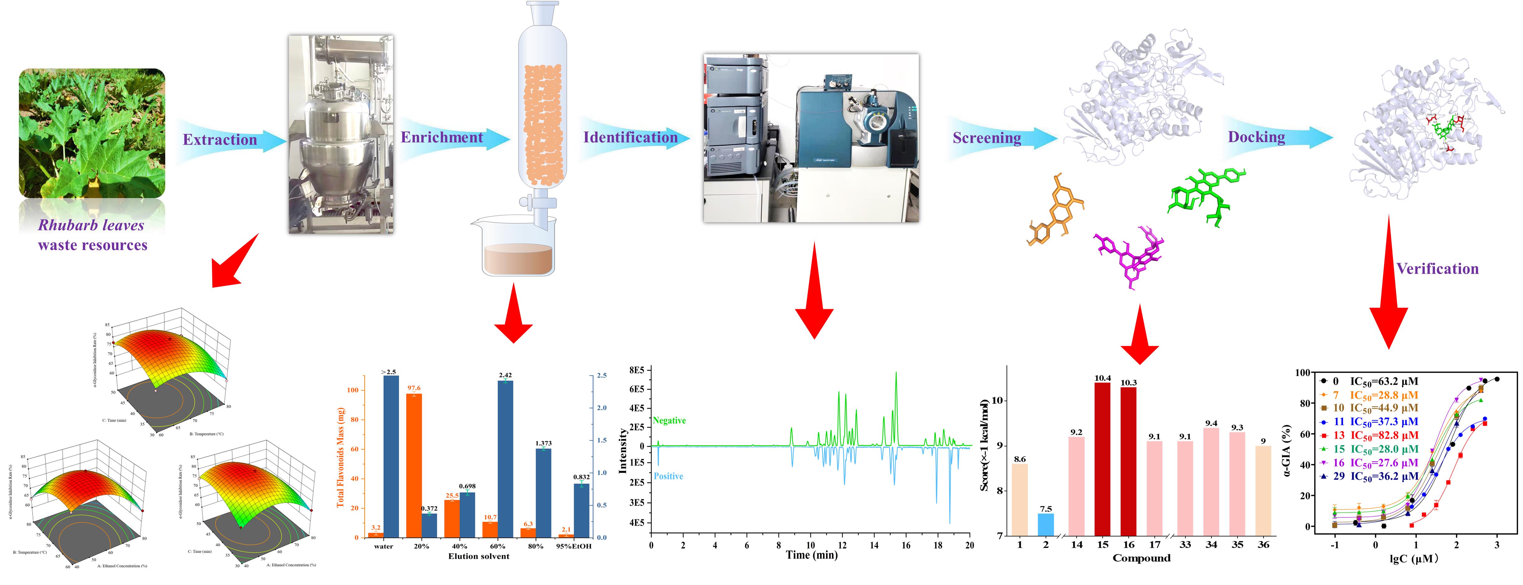 中國科學院西北高原生物研究所高原藏藥資源質控與藥理毒理評價研究團隊以α-葡萄糖苷酶抑制活性作為關鍵評價指標,建立了基于大孔吸附樹脂富集、UPLC-QTOF-MS/MS分析表征、分子對接、體外驗證的唐古特大黃葉中α-葡萄糖苷酶抑制劑的系統(tǒng)篩選策略,篩選得到myricitrin、rumarin等6個α-葡萄糖苷酶抑制劑?;诜€(wěn)態(tài)、同步、三維熒光光譜和遠紫外圓二色譜等多光譜技術的對接機制研究表明,6個抑制劑均能與α-葡萄糖苷酶發(fā)生結合并改變靶蛋白的酪氨酸和色氨酸殘基微環(huán)境,通過降低靶蛋白α-螺旋或β-轉角等二級結構的含量從而導致蛋白酶失活,該研究為唐古特大黃廢棄資源的利用提供了新的見解。