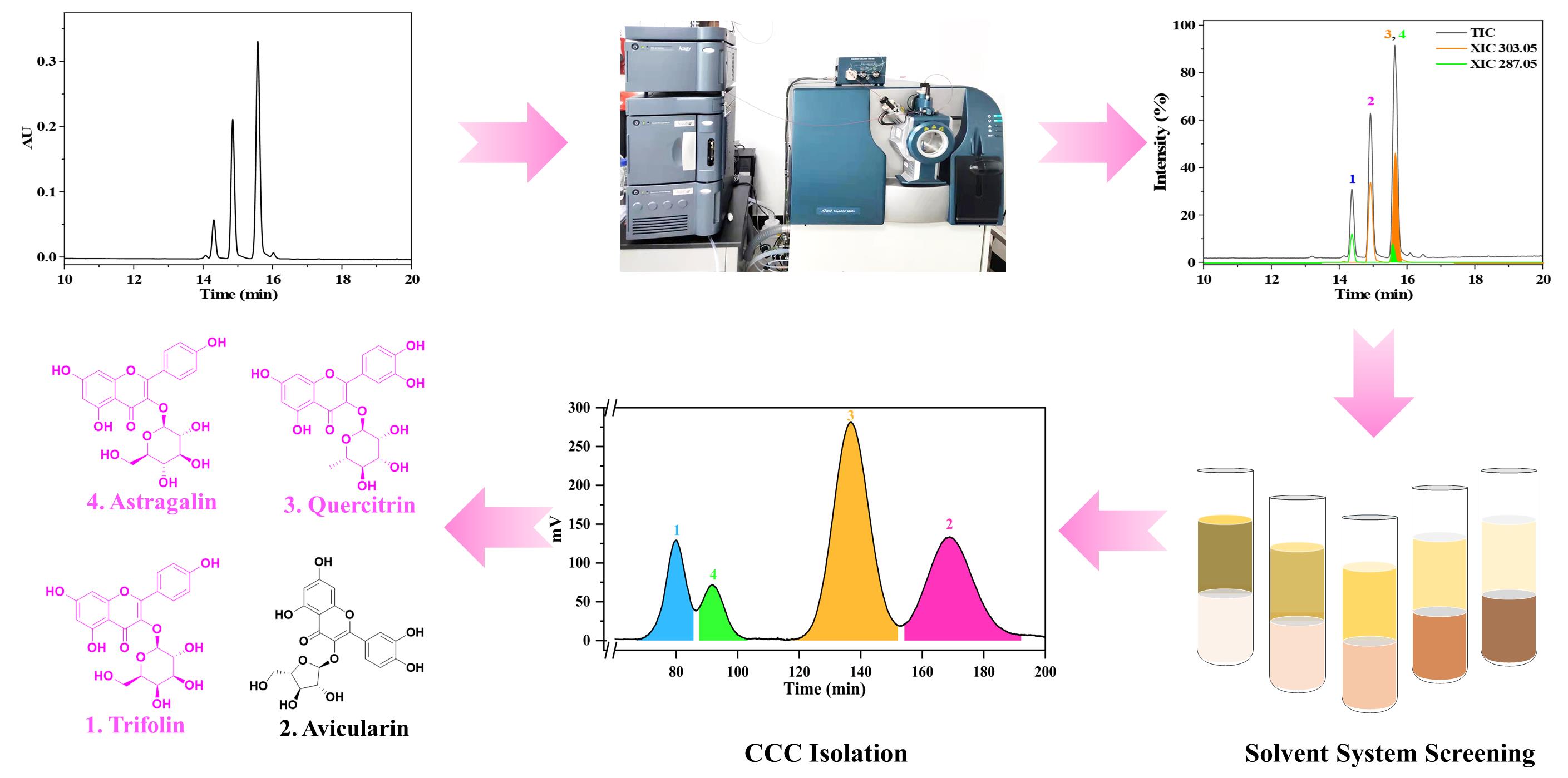 另外,由于天然產(chǎn)物組成成分和結構復雜多樣,常常會出現(xiàn)色譜共洗脫現(xiàn)象,難以被發(fā)現(xiàn)、分析和分離。針對這一挑戰(zhàn),研究團隊提出一種基于UPLC-QTOF-MS/MS和CCC的HPLC共洗脫異構體的差異識別和靶向分離策略。通過UPLC-QTOF-MS/MS實現(xiàn)了對共洗脫異構體的差異特征精確識別和準確定量,解決了共洗脫異構體無法進行CCC溶劑系統(tǒng)篩選的關鍵技術問題。基于此策略,成功從唐古特大黃葉中分離得到astragalin等四種高純度的黃酮類化合物,其中三個互為異構體。該研究為天然產(chǎn)物分離過程中共洗脫異構體的分析和分離提供了新的思路。
