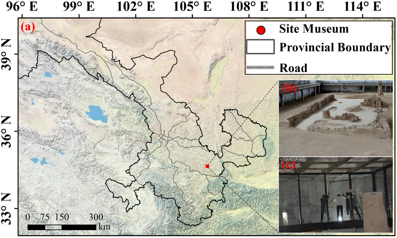 圖1. 大地灣F901遺址(a)遺址位置;(b)遺址;(c)周邊玻璃幕墻圍擋措施