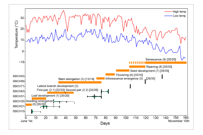 生長發(fā)育階段及其標志性發(fā)育事件的確認是開展遺傳學研究、建立表型變異和遺傳控制基因之間因果關(guān)系的重要前提條件?;趪HBBCH編碼系統(tǒng),課題組定義了9個沙蓬生長發(fā)育階段,涵蓋了整個生活史,明確了標志性發(fā)育事件,建立了沙蓬BBCH編碼系統(tǒng)。通過大田實驗,驗證了該編碼系統(tǒng)的可行性,量化了各個主要階段及其次級細分階段的時間持續(xù)范圍,為開展沙蓬種質(zhì)資源評價、分子遺傳學研究和遺傳馴化建立了生長發(fā)育時期轉(zhuǎn)換的表型參考標準。