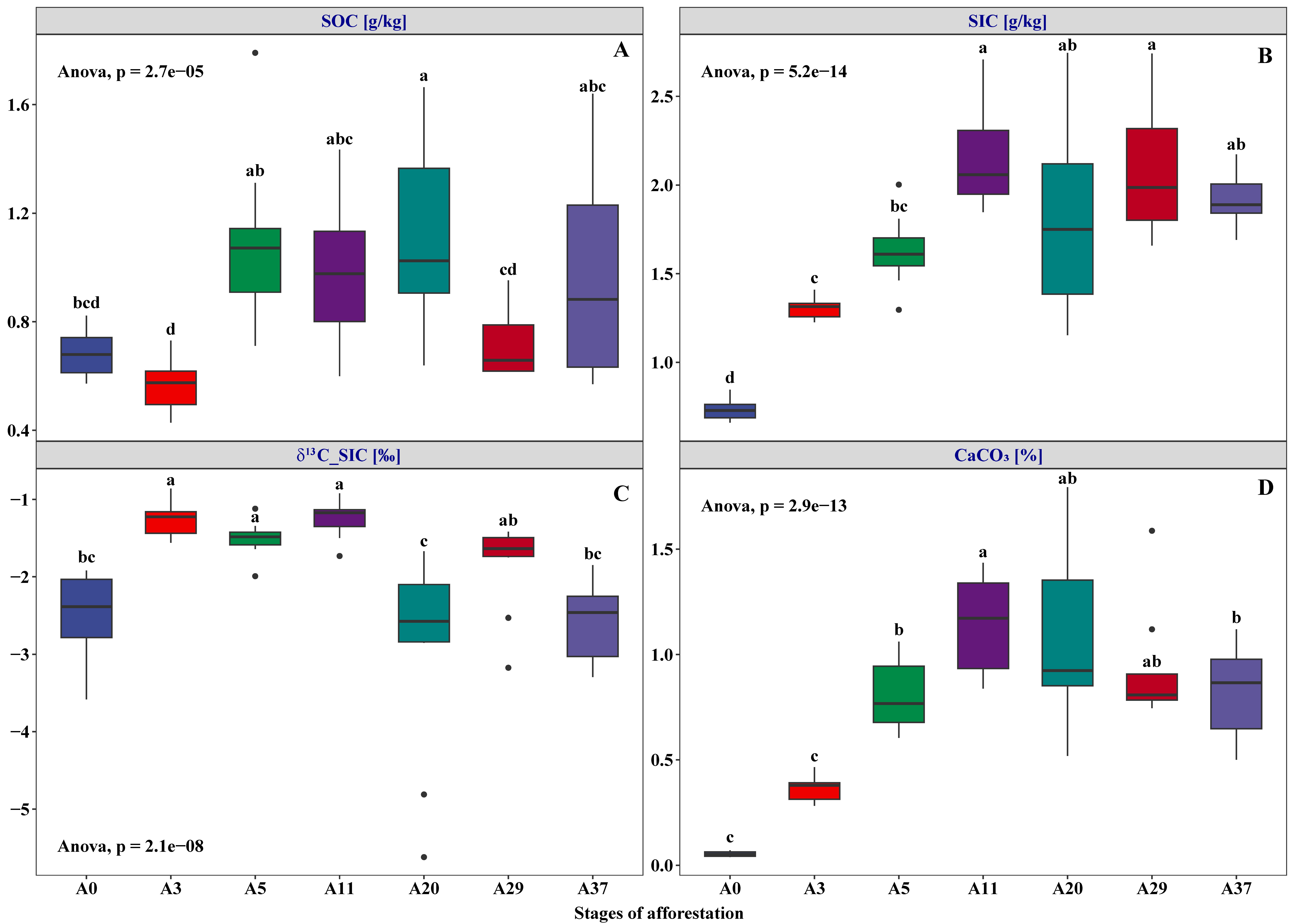 研究結果顯示,隨著飛播造林植被群落的不斷演替,飛播造林顯著改變了沙地土壤理化性質(zhì)和微生物群落結構,同時大量的鹽分和氮元素隨著掉落物和生物量進入土壤,在荒漠區(qū)豐富的鈣離子和鎂離子膠結作用下,形成土壤團聚體,從而起到固定土壤有機碳的作用。