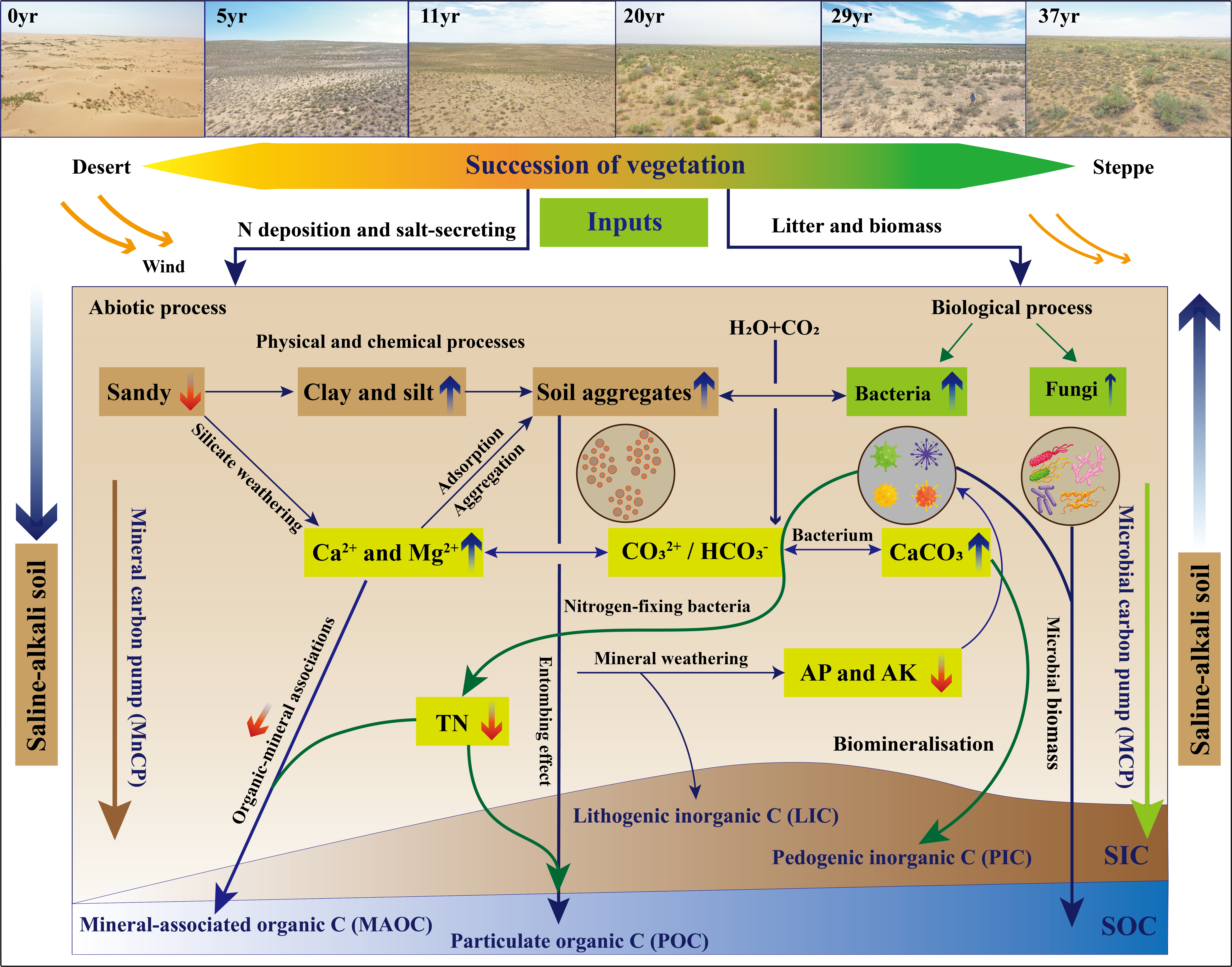 土壤有機碳(SOC)含量及變化是土壤健康評估的重要指標。但對于以鹽堿土為主的荒漠區(qū)而言,土壤無機碳(SIC)含量及變化對生態(tài)系統(tǒng)的健康和穩(wěn)定同樣重要。以往研究表明:人工造林顯著增加了土壤SOC和SIC含量,但對SOC和SIC變化的影響因素及生物和非生物因素的理解還存在不足。因此,研究荒漠區(qū)人工固沙植被群落土壤碳含量變化及影響機理對于沙漠化防治技術提升、沙漠邊緣阻擊戰(zhàn)順利實施及我國北方防沙帶建設等具有重要意義。
