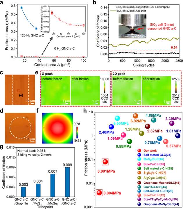 同時,研究人員發(fā)現(xiàn)碳薄膜表面石墨烯片段之間彼此排列角度各異、呈現(xiàn)出無序性。這種結(jié)構(gòu)無序性誘導(dǎo)與石墨表面之間非公度性,加之薄膜整體成型制備避免了石墨烯邊緣暴露,有效減弱了阻礙結(jié)構(gòu)超潤滑放大的邊緣效應(yīng),從而通過石墨島尺度逐級增加,實(shí)現(xiàn)了濕度不敏感超潤滑跨尺度放大。本研究也存在不足,近似無磨損的設(shè)計,限制了體系承載性等性能的提高。