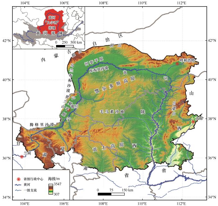 黃河“幾字彎”是荒漠化綜合防治和“三北”工程建設(shè)三大標(biāo)志性戰(zhàn)役的發(fā)起地之一,也是黃河流域生態(tài)保護(hù)和高質(zhì)量發(fā)展的重點(diǎn)區(qū)域。黃河“幾字彎”因黃河繞行此區(qū)域的形狀似彎曲環(huán)抱的“幾”字而得名,泛指黃河流經(jīng)的甘肅、寧夏、內(nèi)蒙古、陜西、山西五省份的行政都市圈(圖1)。