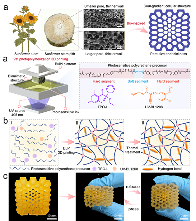 相關(guān)研究成果分別以“Multiple H-bonds Induced Mechanically Robust Vat Photopolymerization 3D Printing Poly(urethane-urea) Elastomers”和“Sunflower Pith Inspired Dual-Gradient Cellular Polyurethane Architecture with Amplified Mechanical Functions”為題發(fā)表在Materials Horizons(Materials Horizons,2024,https://doi.org/10.1039/D4MH01191K)和Chemical Engineering Journal(Chemical Engineering Journal,2024,500,156740)上。石河子大學(xué)聯(lián)培博士生楊星星和中國科學(xué)院大學(xué)博士生白常成分別為論文第一作者,蘭州化物所劉德勝助理研究員和王曉龍研究員為共同通訊作者。