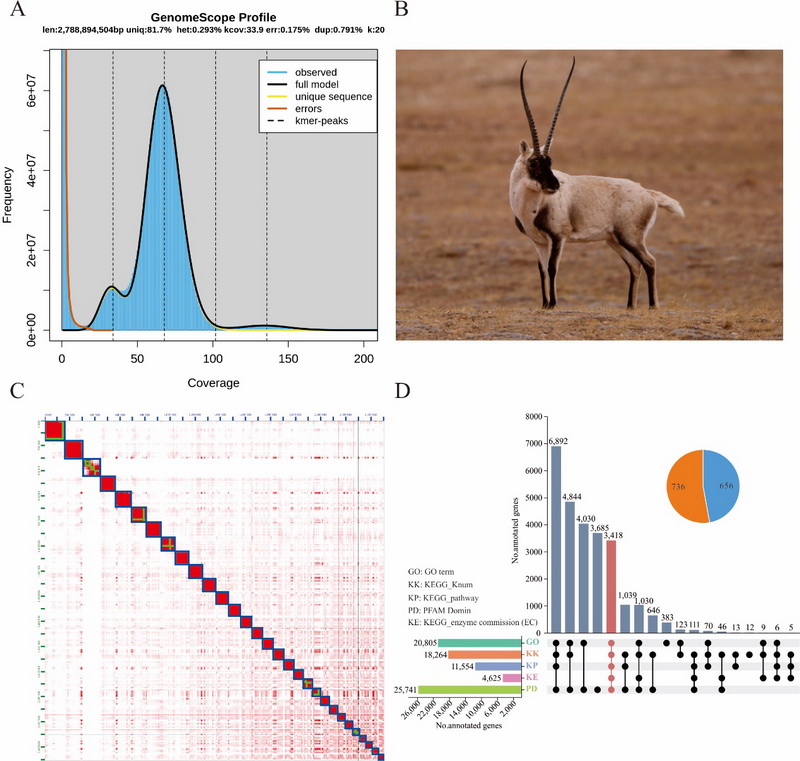 中國科學(xué)院西北高原生物研究所動物生態(tài)與資源保護研究團隊聯(lián)合青海大學(xué),基于PacBio HiFi三代基因組測序、Hi-C測序和DNBSEQ-T7二代基因組survey測序三種測序技術(shù),成功組裝了藏羚染色體級別的基因組。結(jié)果顯示,藏羚基因組大小為3.1 Gb,Contig N50為84.6 Mb,所有基因掛載到30條染色體上(29 + X),與之前的核型研究一致。數(shù)據(jù)評估顯示,藏羚基因組BUSCO得分為98.2%(S:92.3%,D:5.9%,F(xiàn):0.8%,M:1.0%),平均QV值為70.14,表明組裝的連續(xù)性好,完整度和準確性高?;贓DTA和RepeatModeler從頭預(yù)測的藏羚基因組中重復(fù)序列注釋結(jié)果表明,藏羚基因組重復(fù)序列主要由SINEs、LINEs、LTRs 和DNA transposons四種類型組成,序列總長度為1.65 Gb,占基因組的52.47%;基于蛋白同源預(yù)測、蛋白從頭預(yù)測和深度學(xué)習(xí)等多種策略,在藏羚基因組上共注釋到28,330個功能基因。綜上,通過多種技術(shù)手段,首次獲得了藏羚染色體水平的高質(zhì)量基因組和注釋信息,為藏羚的適應(yīng)進化遺傳機制、保護遺傳學(xué)研究及進一步探索物種遷徙行為的遺傳機制提供了重要的基因組資源。