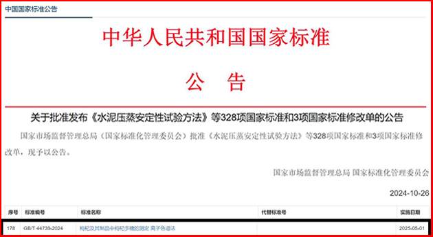 該團(tuán)隊(duì)自2019年起,以枸杞多糖為研究對(duì)象,開展了枸杞多糖含量分析新方法的研究和國家標(biāo)準(zhǔn)的制訂。10月26日,由蘭州化物所牽頭、寧夏回族自治區(qū)藥品檢驗(yàn)研究院等單位參與制訂的國家標(biāo)準(zhǔn)《枸杞及其制品中枸杞多糖的測(cè)定 離子色譜法》(GB/T 44739-2024),由國家市場(chǎng)監(jiān)督管理總局(國家標(biāo)準(zhǔn)化管理委員會(huì))批準(zhǔn)發(fā)布,將于2025年5月1日正式實(shí)施。