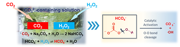 圖1. CO2同H2O2、CO32-間自發(fā)串聯(lián)反應(yīng)衍生HCO4-構(gòu)建的原位氧化體系。