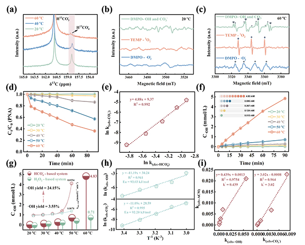 圖2.(a-e)CO2衍生HCO4-的生成轉(zhuǎn)化;(f,g)·OH的定量分析;(h,i)選擇性活化HCO4-生成·OH和CO3·-的相關(guān)性研究。