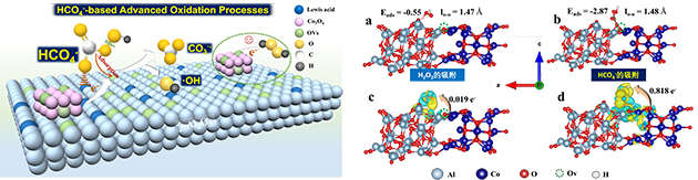 圖3.(左)雙活性中心催化劑催化活化CO2衍生HCO4-;(右)Co/Al2O3選擇性吸附H2O2和HCO4-的DFT理論計算。