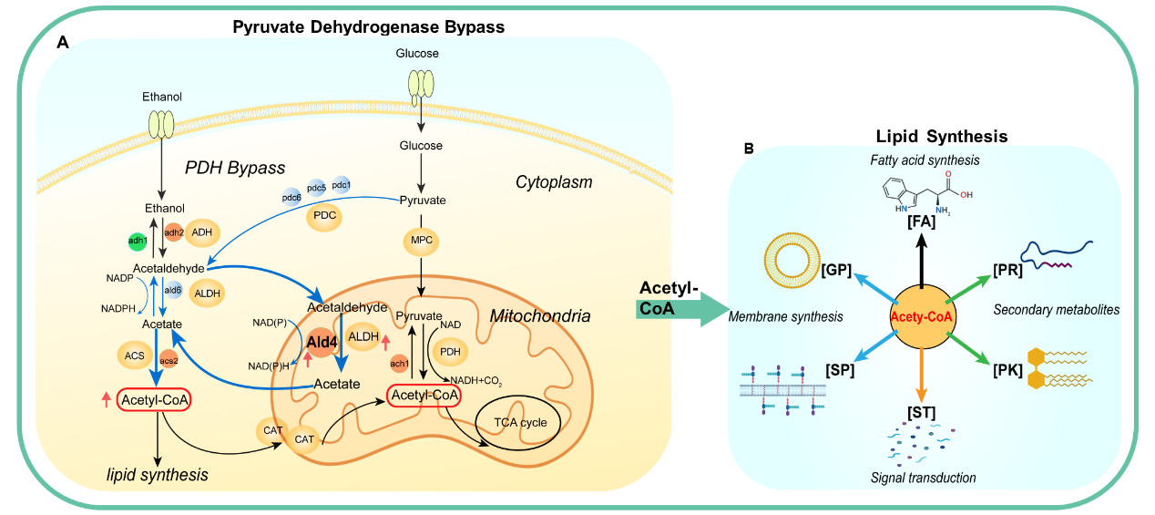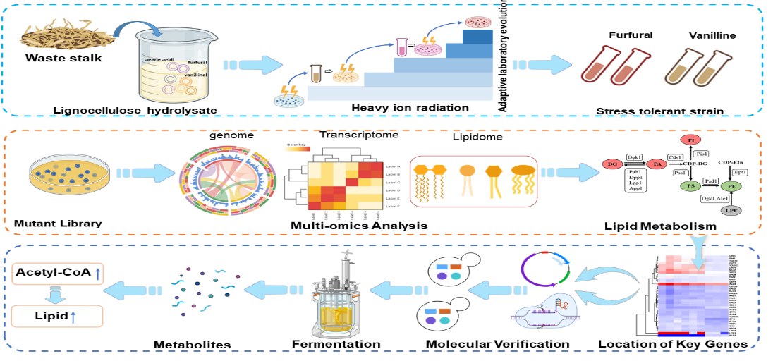 基于此現(xiàn)狀,科研人員利用蘭州重離子加速器(HIRFL)對目標(biāo)突變體實施多輪輻射,結(jié)合ALE技術(shù)提高了酵母的抗逆性和耐受性,因此獲得了適應(yīng)性更強的底盤細(xì)胞。再通過多組學(xué)聯(lián)合分析方法識別出與其發(fā)酵性能相關(guān)的重要基因,利用基因編輯技術(shù)對代謝通路進行精準(zhǔn)優(yōu)化,著重優(yōu)化了核心代謝中間產(chǎn)物的代謝通量,使乙酰輔酶A水平較之前提高了17.10%,從而顯著提高了酵母在合成脂類和其他高附加值化合物方面的產(chǎn)量。