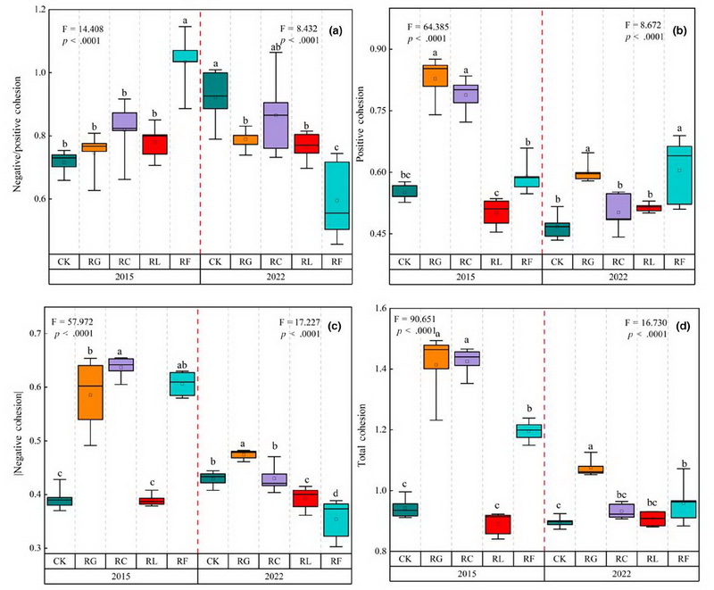 不同時間段下植物功能群去除后群落中負(fù)內(nèi)聚力與正內(nèi)聚力情況