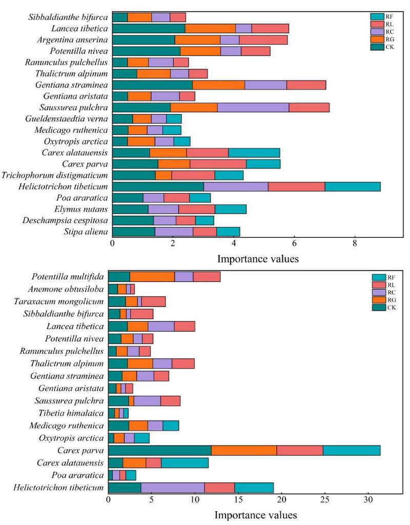 研究結(jié)果以?Effects of short-and long-term plant functional group loss on alpine meadow community structure and soil nutrients?和?Effects of short- and longterm plant functional group removal on alpine meadow community niche?為題分別發(fā)表在?Ecology and evolution(中國科學(xué)院二區(qū))和?Frontiers in Plant Science(中國科學(xué)院二區(qū))。西北高原所博士研究生魏晶晶為第1作者,周華坤研究員為通訊作者。該研究得到青藏高原地球系統(tǒng)、資源與環(huán)境國家重點實驗室開放課題(TPESER202209)、2020年森林草原生態(tài)保護(hù)與恢復(fù)第二批資金--青海祁連山國家公園祁連山國家公園青海區(qū)生物多樣性保護(hù)項目(QHTX-2021-009)的共同資助。