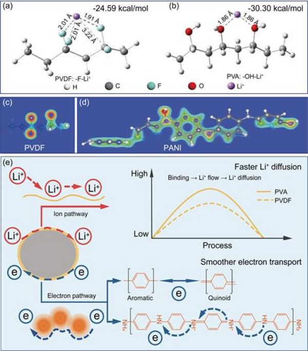 針對電化學吸附過程中電極內Li+擴散速率和電子轉移速率不匹配,從而制約電極電化學活性的問題,設計和制備了離子和電子雙導聚(乙烯醇)-聚苯胺(PVA-PANI)共聚物(CP),并包覆到吸附劑顆粒表面,促進Li+擴散和電子轉移,實現(xiàn)吸附效率的提高。HMO@CP電極具有優(yōu)越的電化學活性和吸附效率,吸附容量高達49.48 mg/g。機理研究表明,PVA中帶負電荷的羥基(-OH)可以富集Li+并加速Li+的擴散,PANI中的共軛結構和氧化還原活性醌類位點提供了更密集的電子分布促進電子轉移(圖1)。該工作以離子擴散和電子轉移為出發(fā)點,以提高離子擴散速率和電子轉移速率匹配度為導向,實現(xiàn)吸附效率的提高(ACS Nano,18?。?024) 31204-31214)。