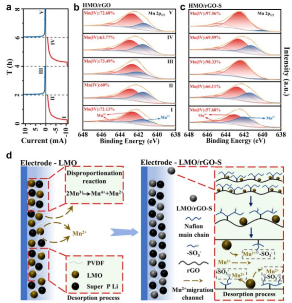 除離子傳輸效率外,針對錳基電活性材料因電極極化導致的穩(wěn)定性較差的問題,采用還原氧化石墨烯(rGO)與Nafion協(xié)同改性的策略制備得到高效穩(wěn)定電化學吸附材料。rGO在增加材料分散性的同時大幅降低了材料極化,緩解極化過程帶來的容量衰減,使得吸附容量和循環(huán)穩(wěn)定性得到提升。研究表明Nafion通過主鏈與還原氧化石墨烯表面羧基結合,而支鏈磺酸基團(-SO3-)可以捕獲因歧化反應溶出的Mn2+,從而使得材料表面局部Mn2+濃度升高(圖2)。經過協(xié)同改性,材料30次循環(huán)容量保持率由79.04%提升至94.64%。該研究驗證了離子捕獲機制抑制歧化反應的可行性,能夠為錳系材料在電化學分離過程中的溶損問題提供新的解決思路(Chem. Eng. J,497?。?024) 155009)。