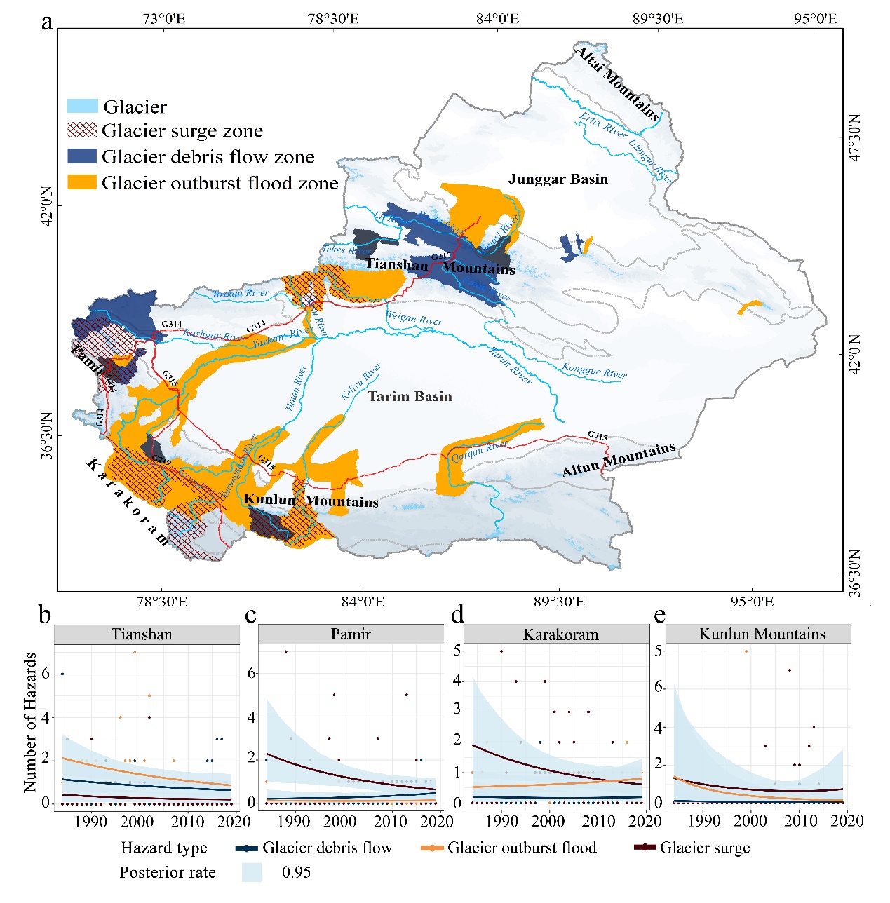 新疆冰川數(shù)量占我國冰川總數(shù)的42%以上。隨著氣候變暖和極端降水事件的頻率增加,冰川持續(xù)退縮導致災害頻發(fā),對下游數(shù)百至數(shù)千公里的城鎮(zhèn)基礎設施和生態(tài)環(huán)境造成了嚴重影響。目前,對新疆冰川災害的研究多局限于獨立事件的單災害類型。因此,對新疆冰川災害進行系統(tǒng)梳理和綜述研究,對揭示冰川災害發(fā)生過程、孕災環(huán)境和機理具有重要意義,有助于提高對冰川災害的認識,為當?shù)胤罏臏p災工作提供科學支撐。