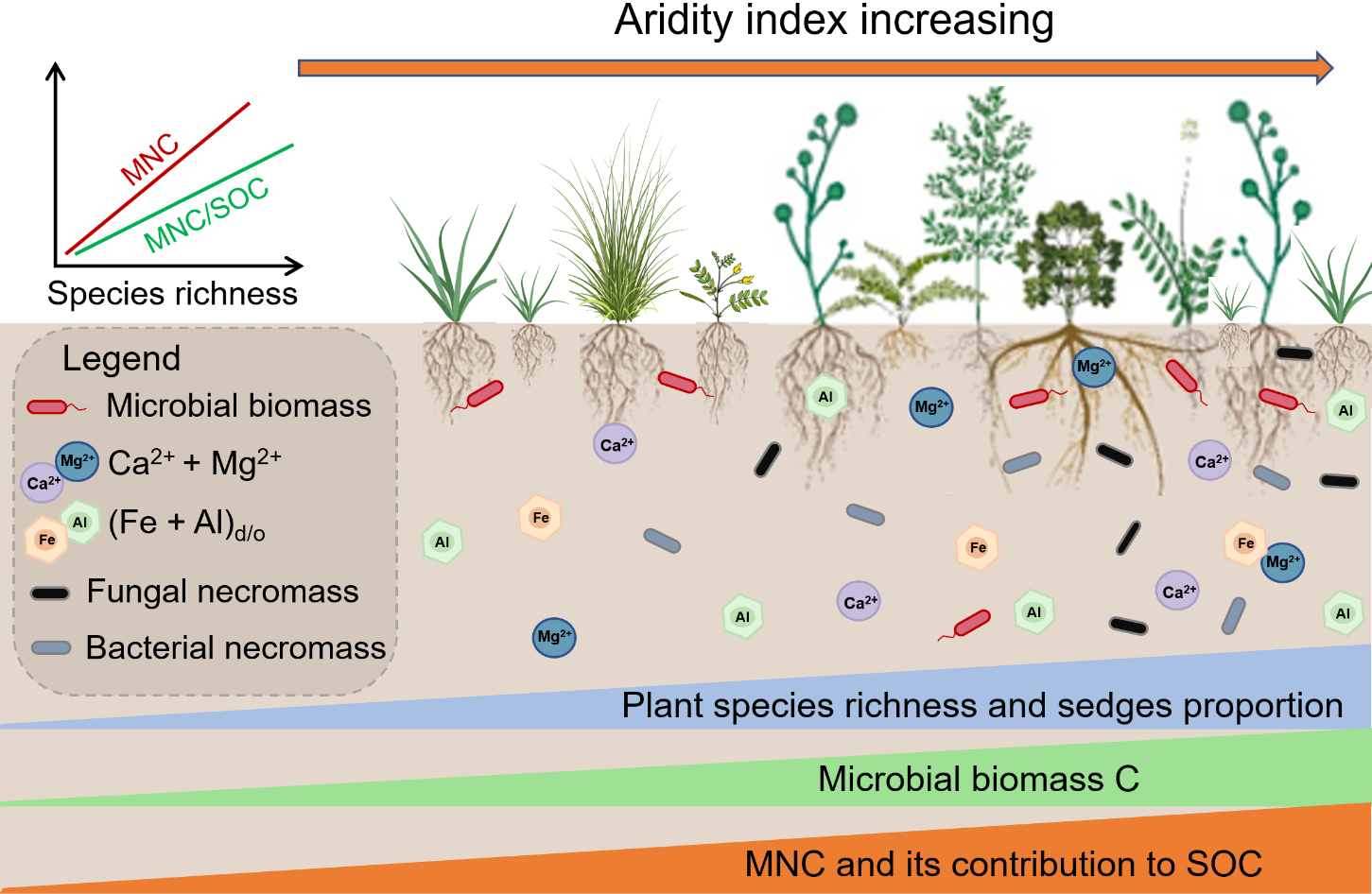 研究表明,隨著干旱指數(shù)的增加(濕度增加),植物種多樣性、植物生物量以及莎草科(Cyperaceae)在地上生物量中的比例顯著增加。同時(shí),MNC含量及其對(duì)SOC的貢獻(xiàn)也隨干旱指數(shù)的增加而增加。結(jié)構(gòu)方程模型及偏相關(guān)分析表明,植物種多樣性在促進(jìn)土壤MNC積累和SOC固存中起關(guān)鍵作用,植物多樣性的提升顯著增加了莎草科植物的豐度,增加了根系生物量和根際沉積,進(jìn)而促進(jìn)了MNC的積累。