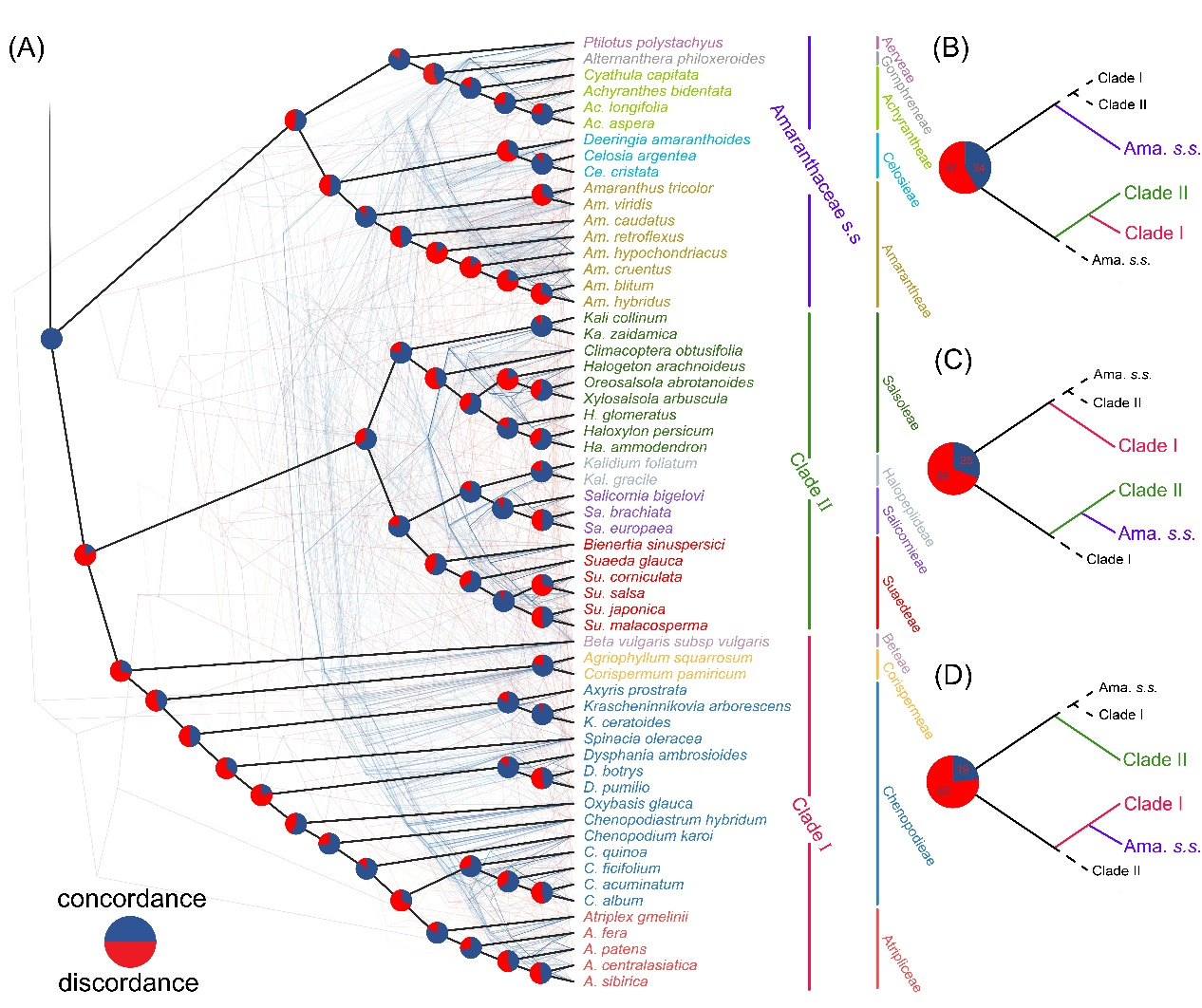 中國科學(xué)院西北高原生物研究所青藏高原植物適應(yīng)與進化研究團隊綜合利用質(zhì)體基因組和全長ITS序列,重建了廣義莧科的系統(tǒng)發(fā)育關(guān)系。通過質(zhì)體基因組結(jié)構(gòu)和序列比對分析,發(fā)現(xiàn)濱藜屬(Atriplex)和藜屬(Chenopodium)存在一段長約5200 bp的反向互補區(qū)域。適應(yīng)性進化分析揭示了8個基因受到顯著的正選擇作用,這些基因可能在廣義莧科的進化中起到了驅(qū)動作用。系統(tǒng)發(fā)育結(jié)果表明,傳統(tǒng)藜科為單系類群,建議恢復(fù)其至科級分類學(xué)水平。對于廣義莧科的科級以下分類群,例如藜屬、鹽生草屬(Halogeton)以及豬毛菜亞族(Subtr. Salsolinae)為并系類群,建議通過建立更多的分類群或?qū)⑥甲澹–henopodieae)和濱藜族(Atripliceae)合并來解決分類問題。核質(zhì)沖突及不完全譜系分選是導(dǎo)致廣義莧科基因樹系統(tǒng)發(fā)育不一致的主要原因。本研究為廣義莧科的系統(tǒng)發(fā)育關(guān)系提供了新的見解,并指出后續(xù)仍需采取多種數(shù)據(jù)集完善廣義莧科的分類修訂。