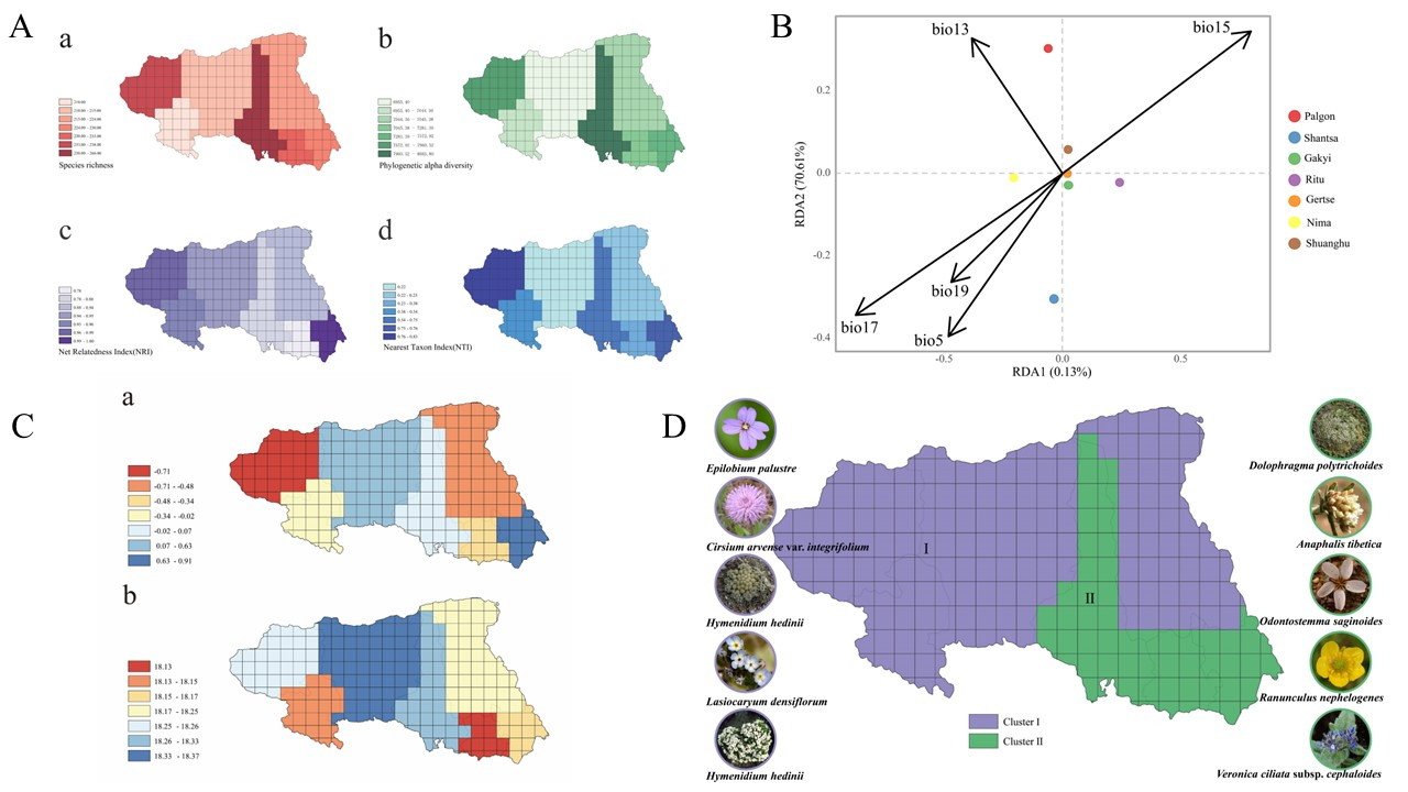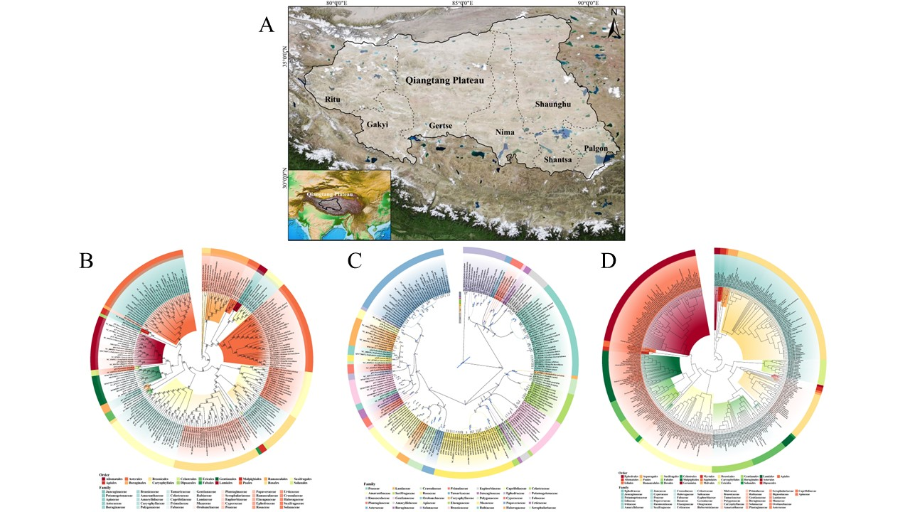 系統(tǒng)發(fā)育區(qū)系學(xué)通過將系統(tǒng)發(fā)育信息整合到植物區(qū)系分析中,推斷區(qū)系內(nèi)物種的分化時間,從而更好地反映不同區(qū)域物種分布及組合的動態(tài)歷史過程,揭示區(qū)系的起源及演化歷史。羌塘高原位于青藏高原腹地,是“世界屋脊的屋脊”,因其獨特且完整的高寒生態(tài)系統(tǒng)以及眾多珍稀瀕危物種成為研究青藏高原乃至世界高寒干旱植物區(qū)系起源及演化歷史的天然實驗室。本研究基于傳統(tǒng)植物區(qū)系學(xué)和系統(tǒng)發(fā)育區(qū)系學(xué)的方法,對羌塘高原種子植物開展區(qū)系研究,重建了370種植物的系統(tǒng)發(fā)育關(guān)系,對研究區(qū)內(nèi)各縣域網(wǎng)格單元進行系統(tǒng)發(fā)育多樣性分析,并結(jié)合平均分化時間和物種分歧時間,探討羌塘高原植物多樣性格局及其形成機制。