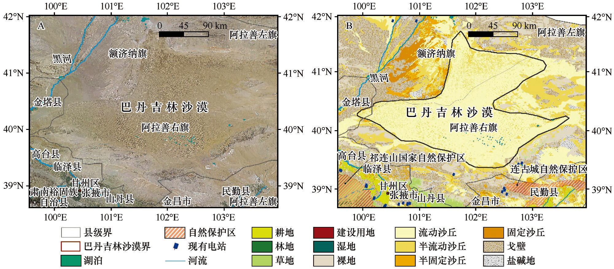 巴丹吉林沙漠及周邊地區(qū)衛(wèi)星影像(A)和沙漠地貌圖(B)