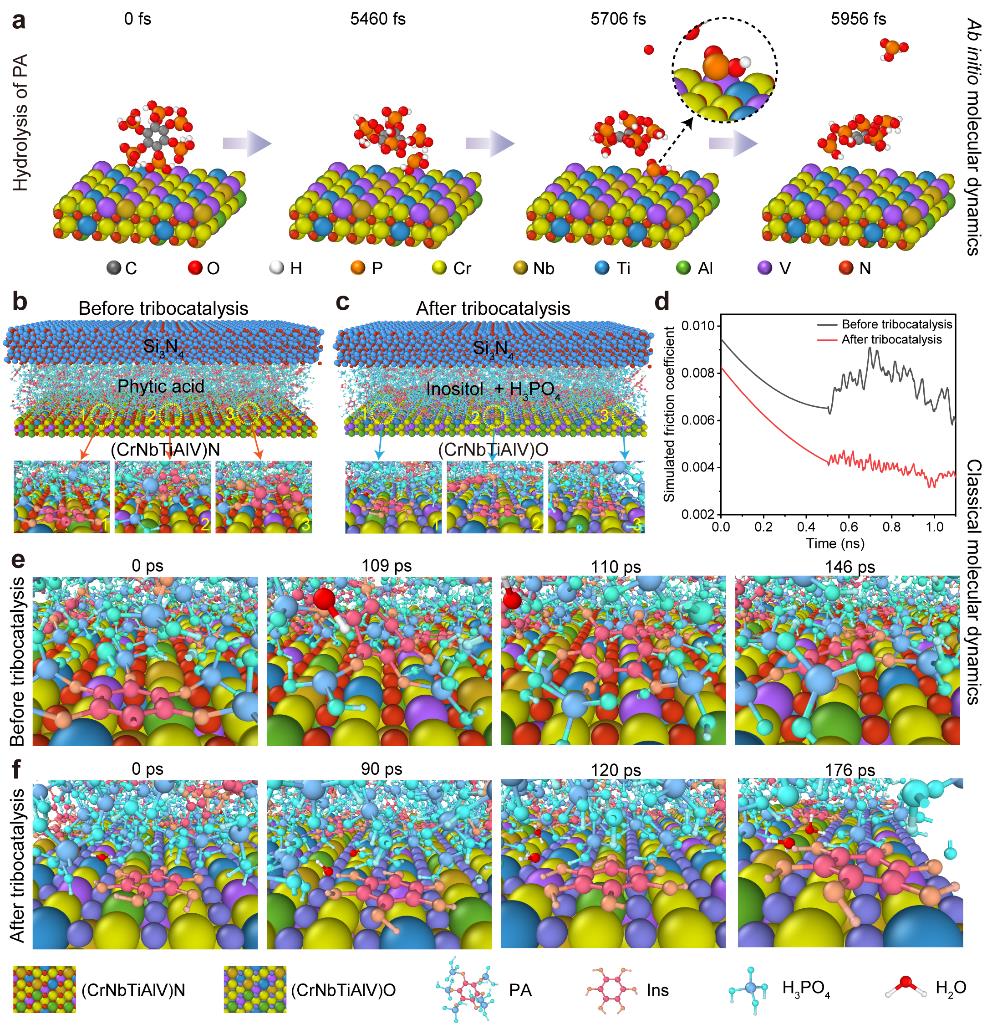 經(jīng)測試,該固-液復(fù)合超潤滑體系可在125萬次往復(fù)摩擦循環(huán)中持續(xù)保持超潤滑狀態(tài),摩擦系數(shù)低至0.0037,磨損率約為3.032×10?10mm3/(N·m)。摩擦過程中原位形成了平均粒徑約為7.3nm的高熵陶瓷納米晶體,這些納米晶體促進了植酸分子的水解,生成了肌醇多磷酸(或肌醇)和磷酸分子。通過分子動力學模擬進一步證明,肌醇和磷酸在滑動過程中可有效降低摩擦阻力,從而在宏觀尺度上實現(xiàn)固-液復(fù)合超潤滑(圖2)。該研究證實了摩擦催化效應(yīng)在超潤滑中的作用,為設(shè)計高性能固-液復(fù)合超潤滑系統(tǒng)提供了新策略。