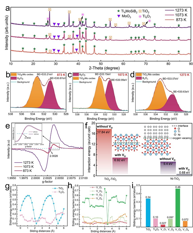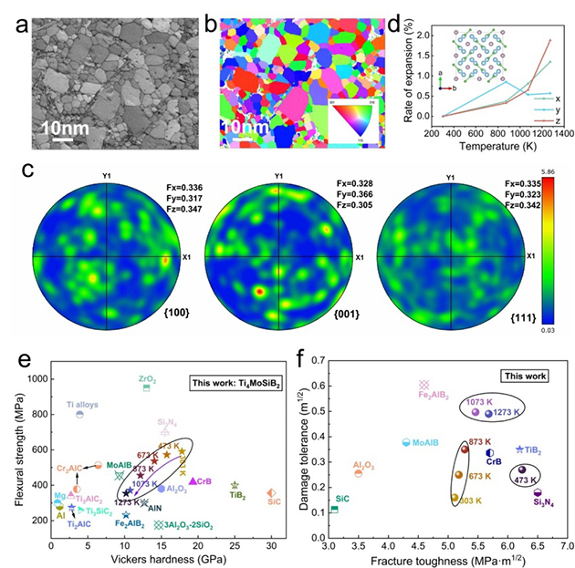 近日,中國科學院蘭州化學物理研究所蘭州潤滑材料與技術創(chuàng)新中心基于T2相通過M位合金化構筑策略成功合成了具有面外化學有序的四元層狀過渡金屬硼化物MAB相—Ti4MoSiB2陶瓷(圖1),并系統(tǒng)研究了其在寬溫域內(nèi)的力學性能和摩擦學行為,研究人員發(fā)現(xiàn)材料原子尺度上的層狀結構在穿晶斷裂時有效引導裂紋偏轉(zhuǎn),改變裂紋擴展路徑,提高低溫斷裂韌性;由于晶粒沿不同方向熱膨脹差異造成晶界的熱失配,進而改變了斷裂模式,使材料在室溫至1000℃范圍內(nèi)表現(xiàn)出優(yōu)異的綜合力學性能,同時賦予了較傳統(tǒng)陶瓷優(yōu)異的損傷容限。與DD5高溫合金對摩時在全溫度范圍內(nèi)都具有良好的抗磨性能,尤其在高溫條件下摩擦化學反應生成的具有氧空位TiO2,一定程度上實現(xiàn)減摩效果,并實現(xiàn)了“負磨損”現(xiàn)象。這些發(fā)現(xiàn)不僅豐富了MAB相材料的基礎理論,也為開發(fā)新型高溫結構功能一體化材料提供了重要指導。