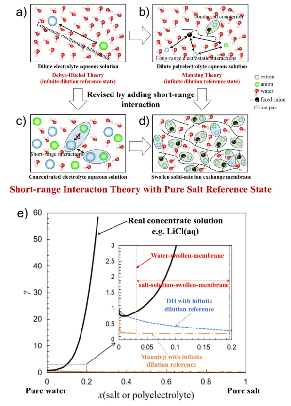 受Kenneth S. Pitzer濃電解質(zhì)溶液理論啟發(fā),研究人員認(rèn)為:離子交換膜的反離子凝聚效應(yīng)相較曼寧理論所描述的稀聚電解質(zhì)溶液要強的多;在純水溶脹的離子交換膜中,絕大多數(shù)的反離子處于凝聚狀態(tài),有效的屏蔽了聚合物鏈上的電荷。因此,自由離子之間的短程作用,而非長程靜電作用,才是決定性的。這點與忽略長程靜電作用的濃電解質(zhì)溶液理論完全一致。據(jù)此,研究人員創(chuàng)新性提出了"純水溶脹膜參考態(tài)"——首次明確區(qū)分了膜內(nèi)反離子與溶液相中反離子的標(biāo)準(zhǔn)化學(xué)勢。