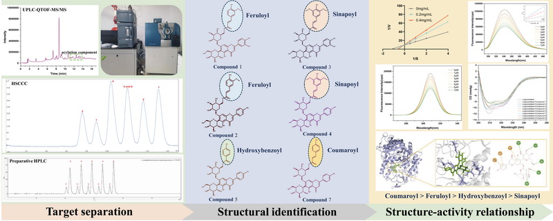 中國(guó)科學(xué)院西北高原生物研究所高原藏藥資源質(zhì)控與藥理毒理評(píng)價(jià)研究團(tuán)隊(duì)通過(guò)建立UPLC-QTOF-MS/MS結(jié)合高速逆流色譜和制備液相色譜的靶向分離技術(shù),成功從青稞苗中分離得到6個(gè)以大麥黃苷和皂草黃苷為母核的不同酰基修飾的衍生物。通過(guò)多維度的分子相互作用研究發(fā)現(xiàn),大麥黃苷和皂草黃苷?;?,其α-葡萄糖苷酶抑制活性均明顯提高,表現(xiàn)為香豆?;?gt;阿魏?;?gt;對(duì)羥基苯甲酰基>芥子?;?個(gè)?;S酮與α-葡萄糖苷酶均具有較高的結(jié)合常數(shù),主要通過(guò)范德華力和氫鍵作用占據(jù)α-葡萄糖苷酶的活性位點(diǎn)并形成穩(wěn)定的復(fù)合物,并改變關(guān)鍵氨基酸殘基和二級(jí)結(jié)構(gòu),從而降低酶催化活性。該研究為復(fù)雜天然產(chǎn)物的靶向分離純化以及?;S酮與α-葡萄糖苷酶抑制活性之間的構(gòu)效關(guān)系的研究提供了新的思路。